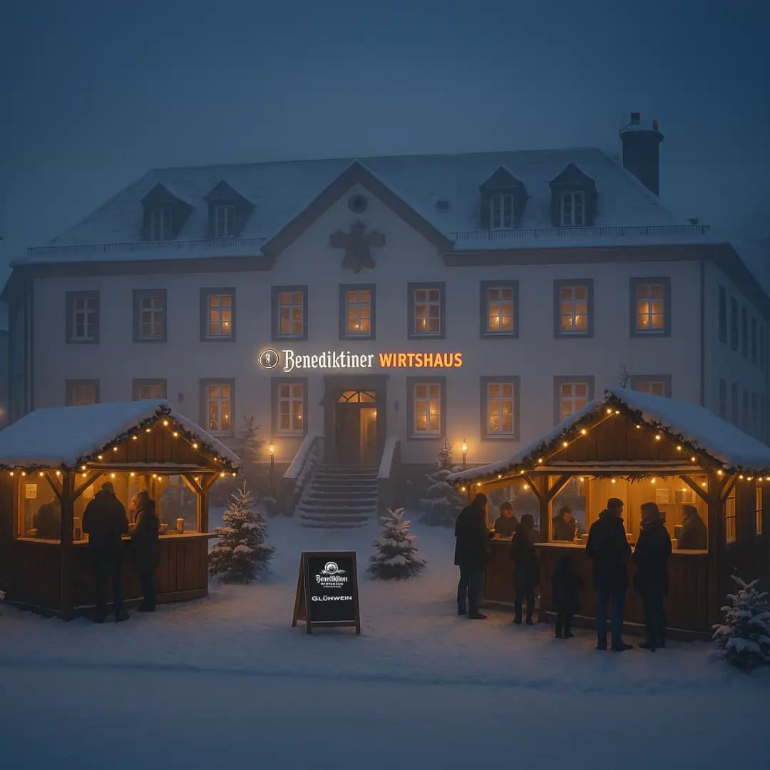 Vor dem Benediktiner Wirtshaus schenken wir Glühwein und andere heiße Köstlichkeiten aus – für eine richtig gute Zeit mit euch. Und wer weiß… vielleicht wird das Wetter dieses Jahr genauso weiß wie auf dem Bild. 😉